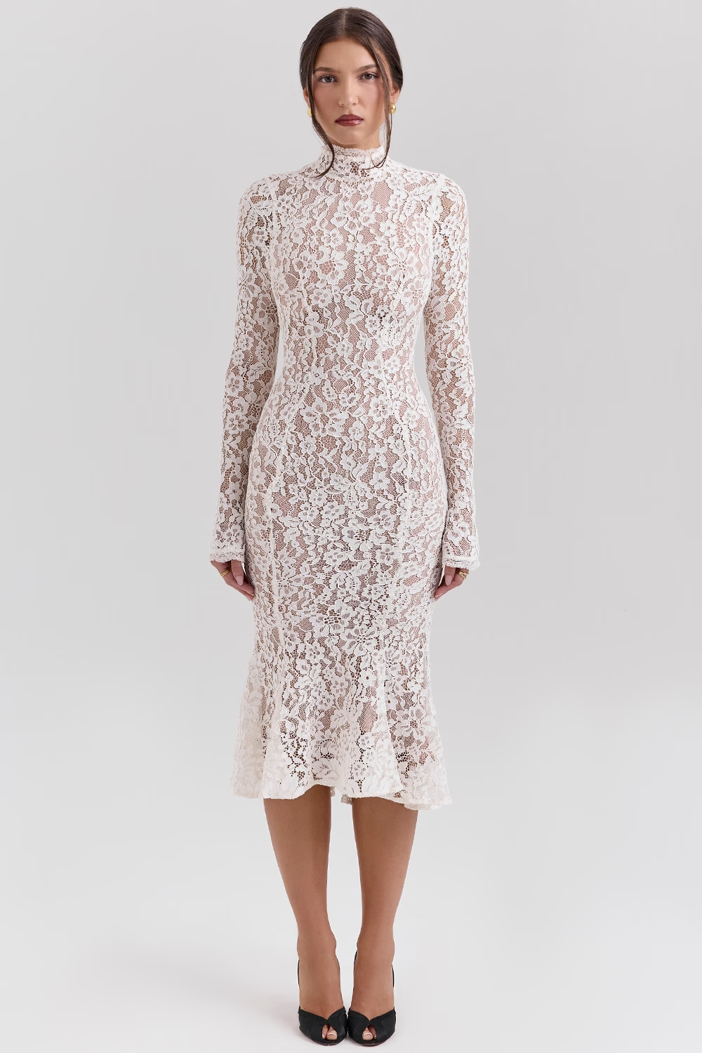 Sophia Vintage Ivory Lace Fitted Midi Dress - Ivory White